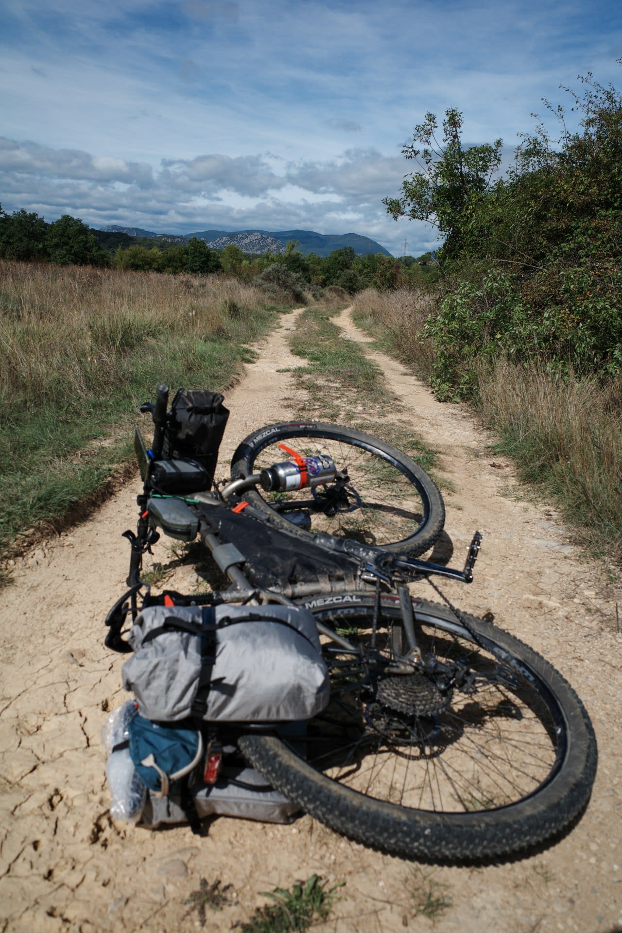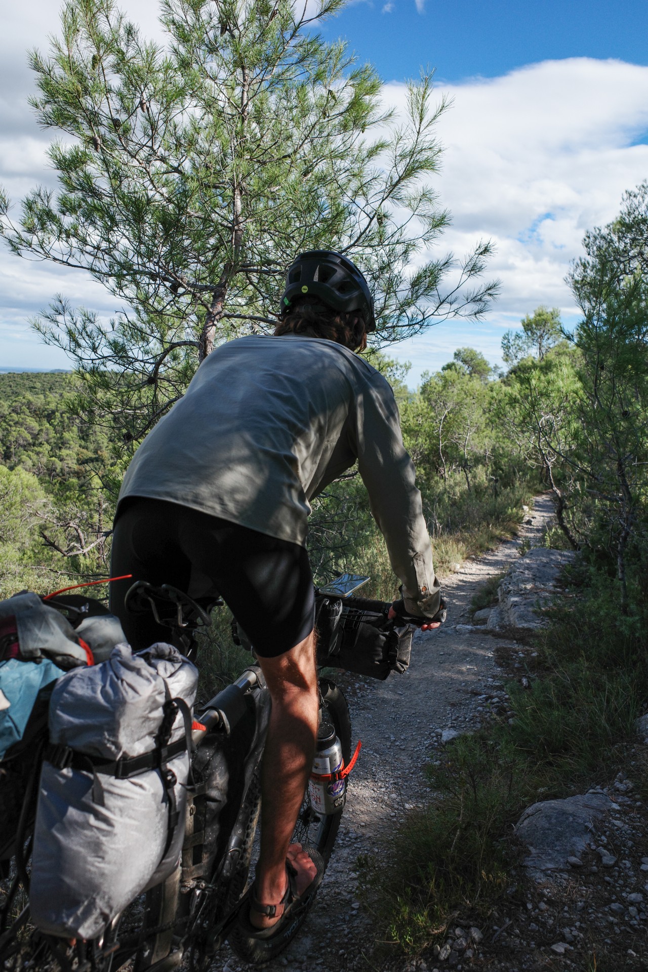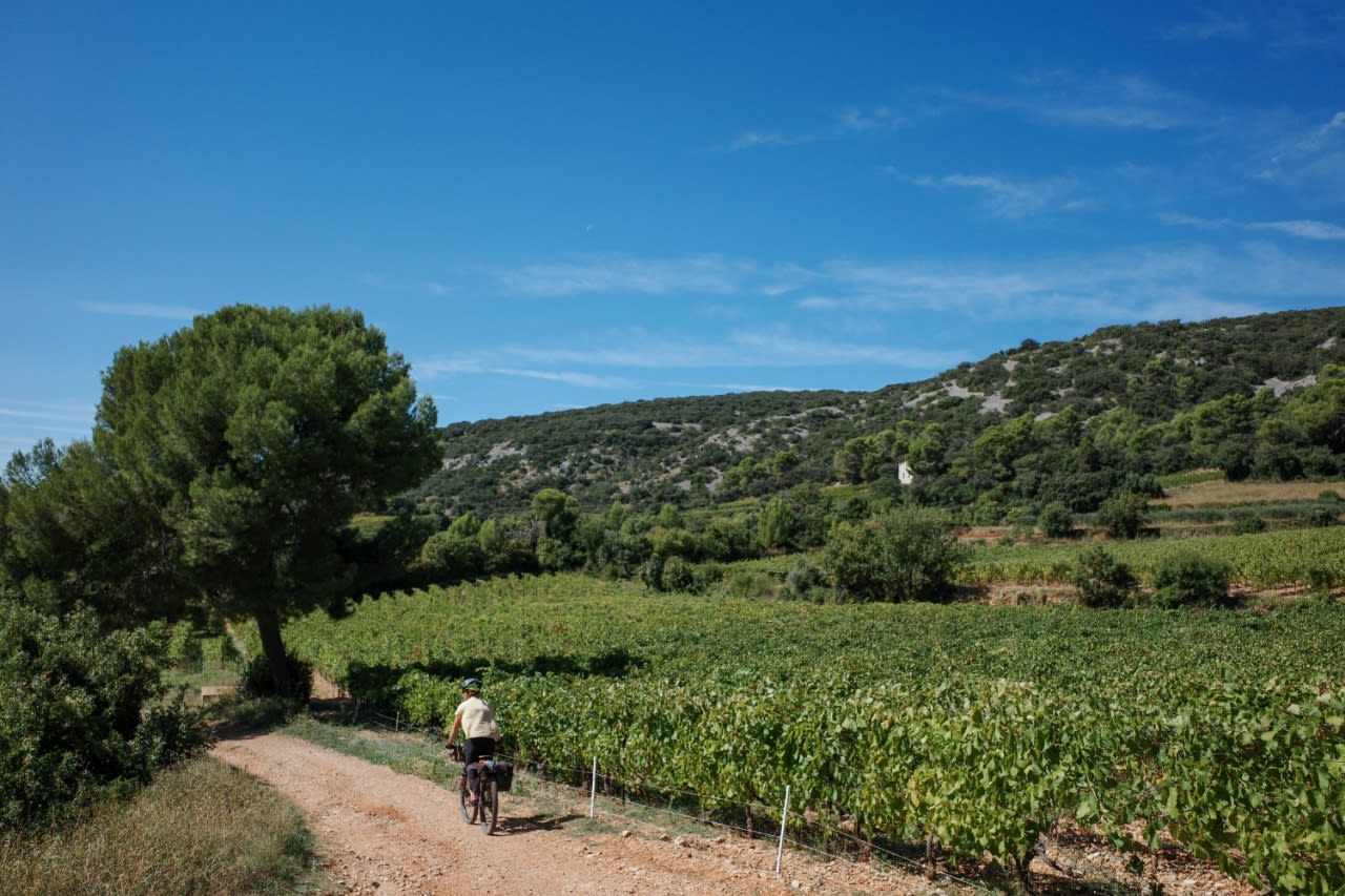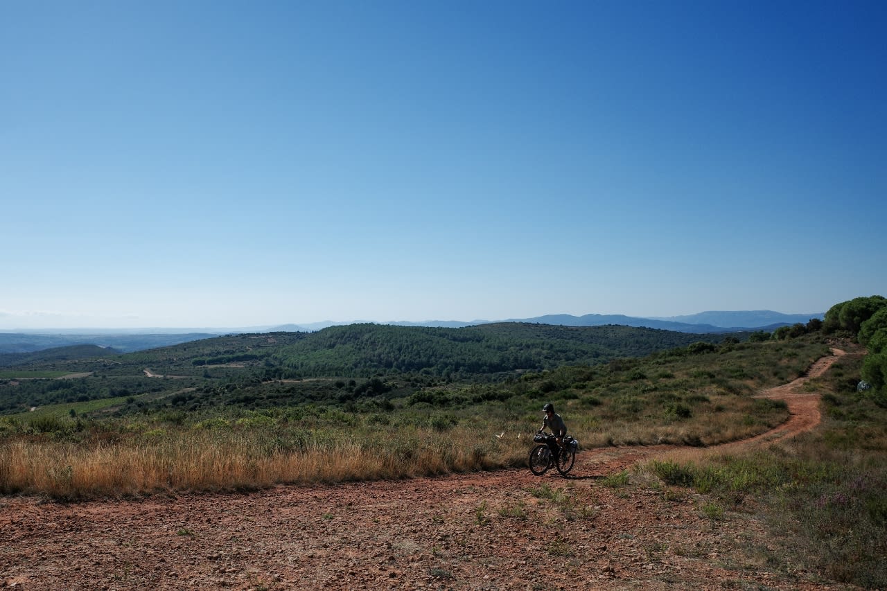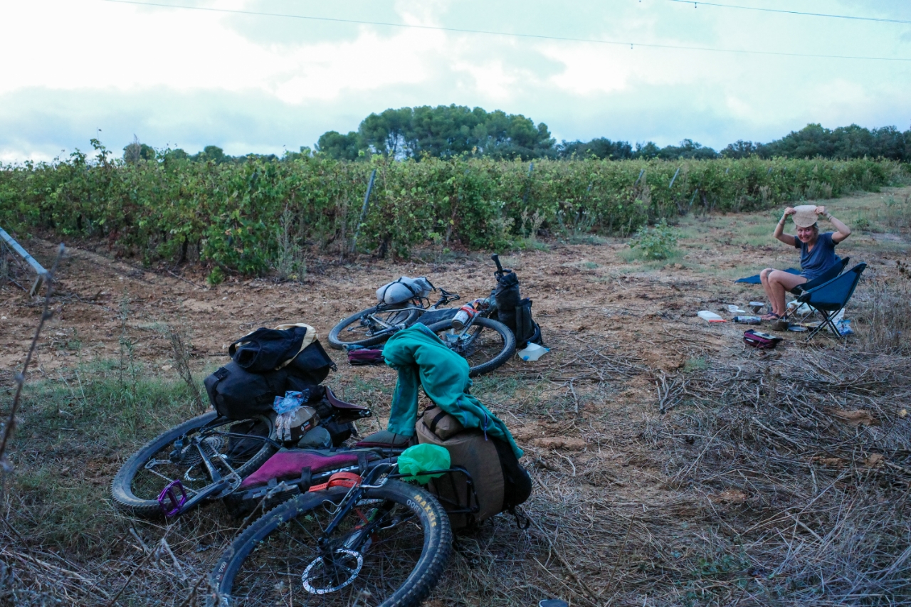 It was hard to leave the place, but we were also excited! The Mediterranean was getting closer, and we had our eyes set on it. We pedalled across this Martian landscape following some technical MTB trails. After that, we were mostly riding gravel trails between the vineyards of the South, crossing many little towns. The whole area is dominated by winegrowing, and it was hard to find good spots to pitch our tent for the night. The small woodlands we did find were too wild to camp in, so we hid in one of the winery domains and cooked our meal there. We pitched the tent at dusk and thought we were golden – but at three AM we heard the sounds of huge harvesting tractors nearby. We didn’t expect them to start that early. We were too alert to sleep after that, so we broke camp and had an early start to the day. We biked to the nearest town and had our coffee there instead! At least we didn’t get caught.