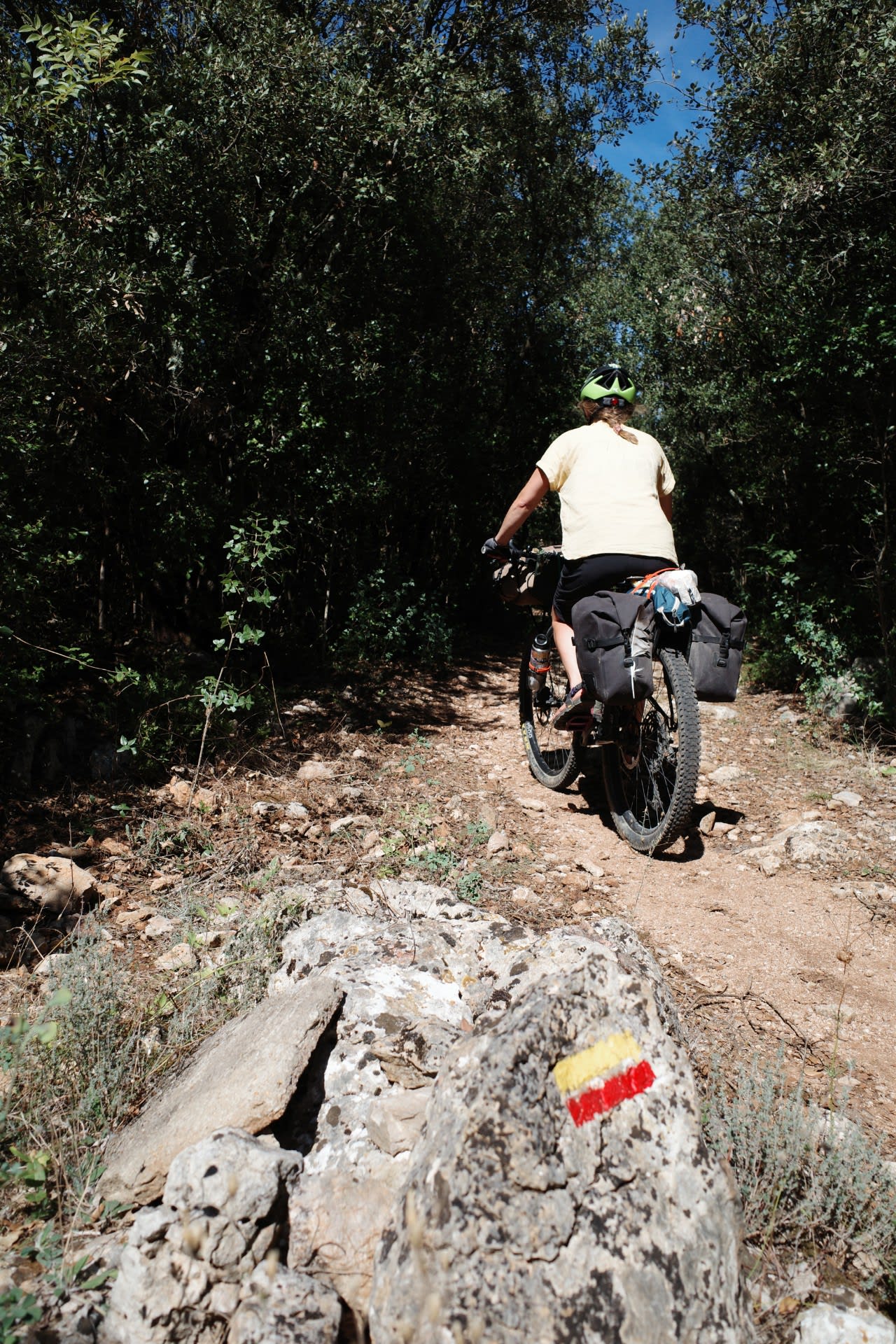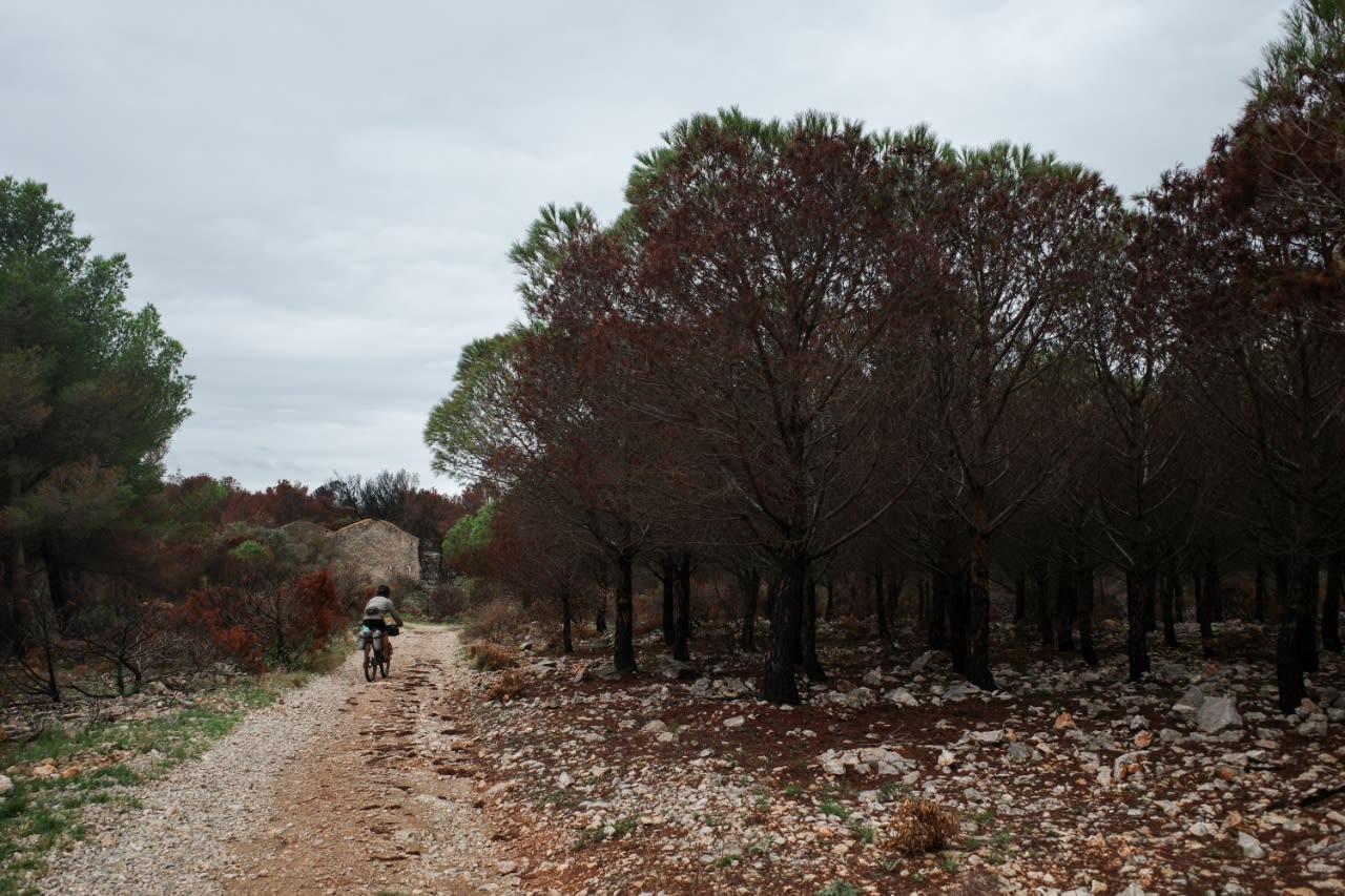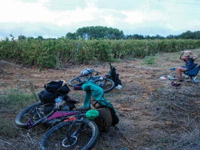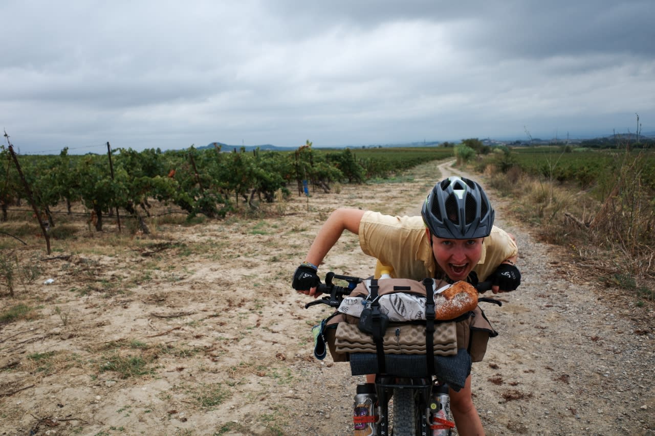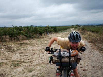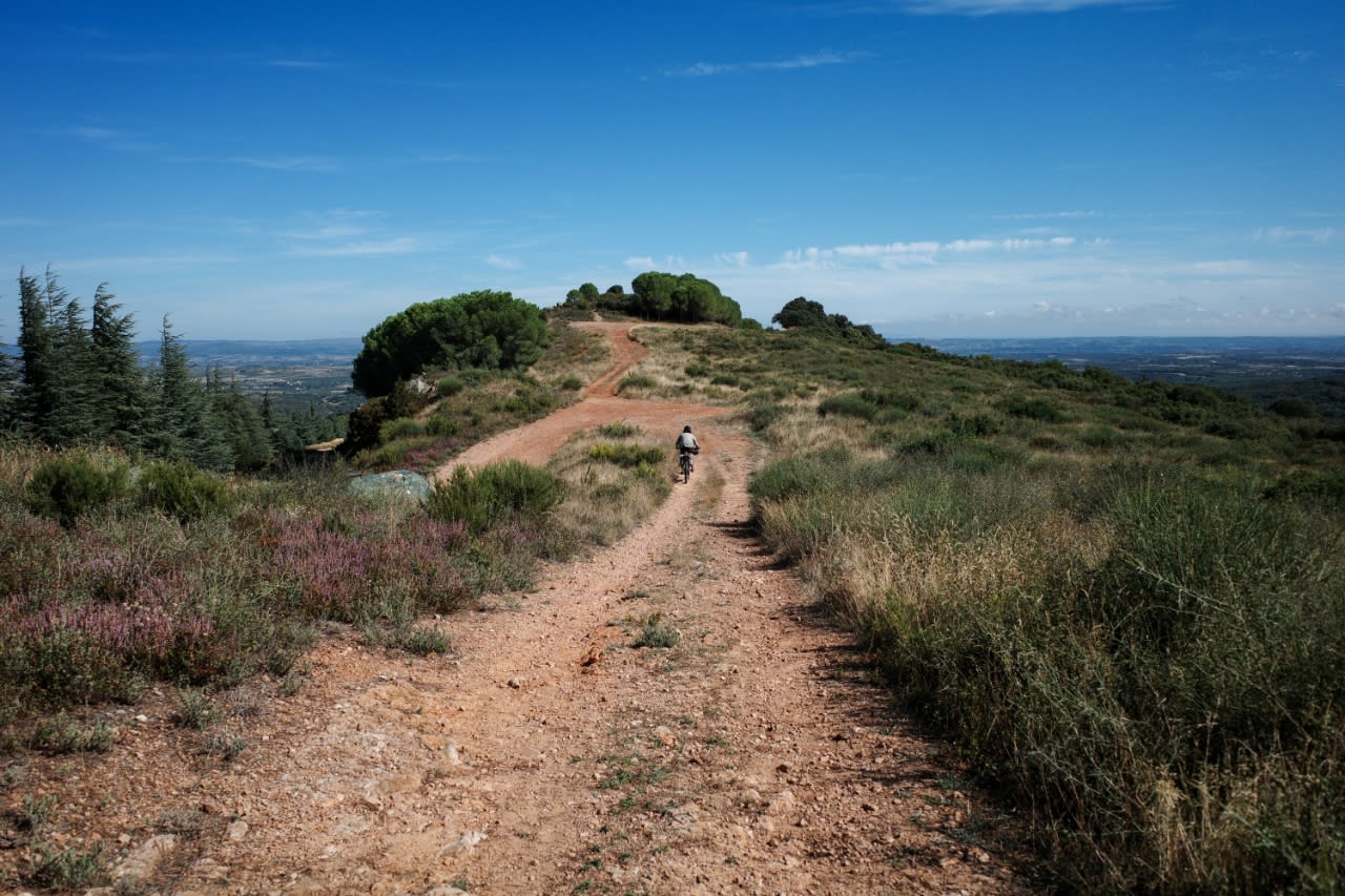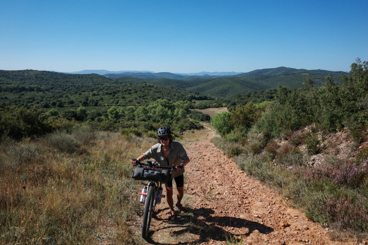 It was hard to leave the place, but we were also excited! The Mediterranean was getting closer, and we had our eyes set on it. We pedalled across this Martian landscape following some technical MTB trails. After that, we were mostly riding gravel trails between the vineyards of the South, crossing many little towns. The whole area is dominated by winegrowing, and it was hard to find good spots to pitch our tent for the night. The small woodlands we did find were too wild to camp in, so we hid in one of the winery domains and cooked our meal there. We pitched the tent at dusk and thought we were golden – but at three AM we heard the sounds of huge harvesting tractors nearby. We didn’t expect them to start that early. We were too alert to sleep after that, so we broke camp and had an early start to the day. We biked to the nearest town and had our coffee there instead! At least we didn’t get caught.