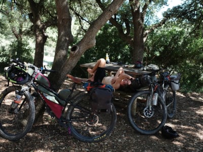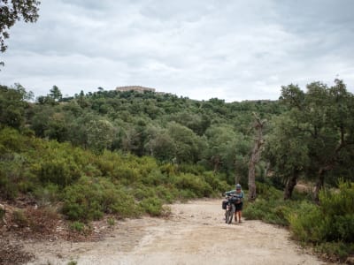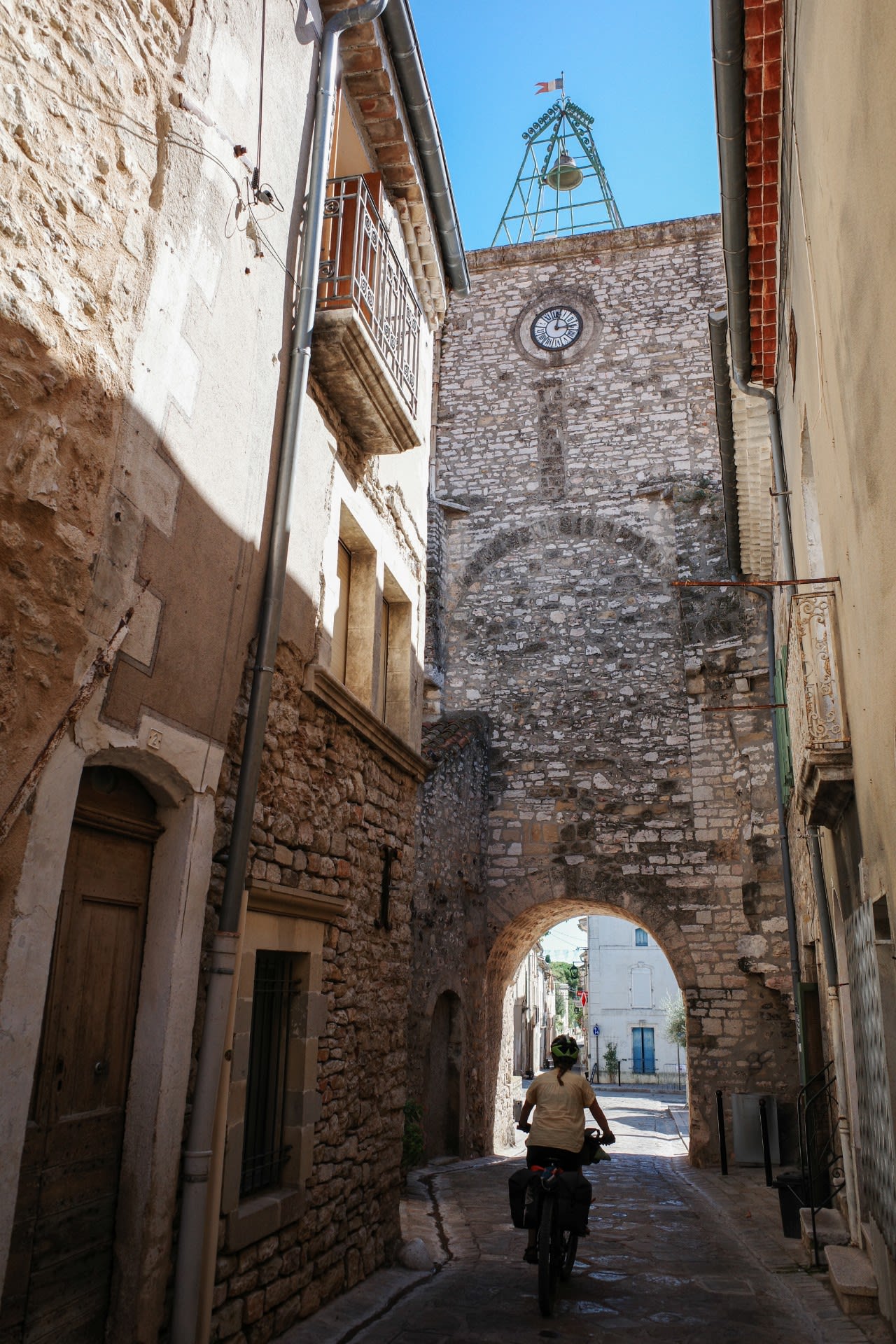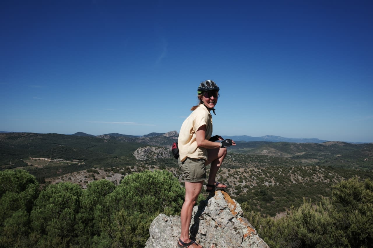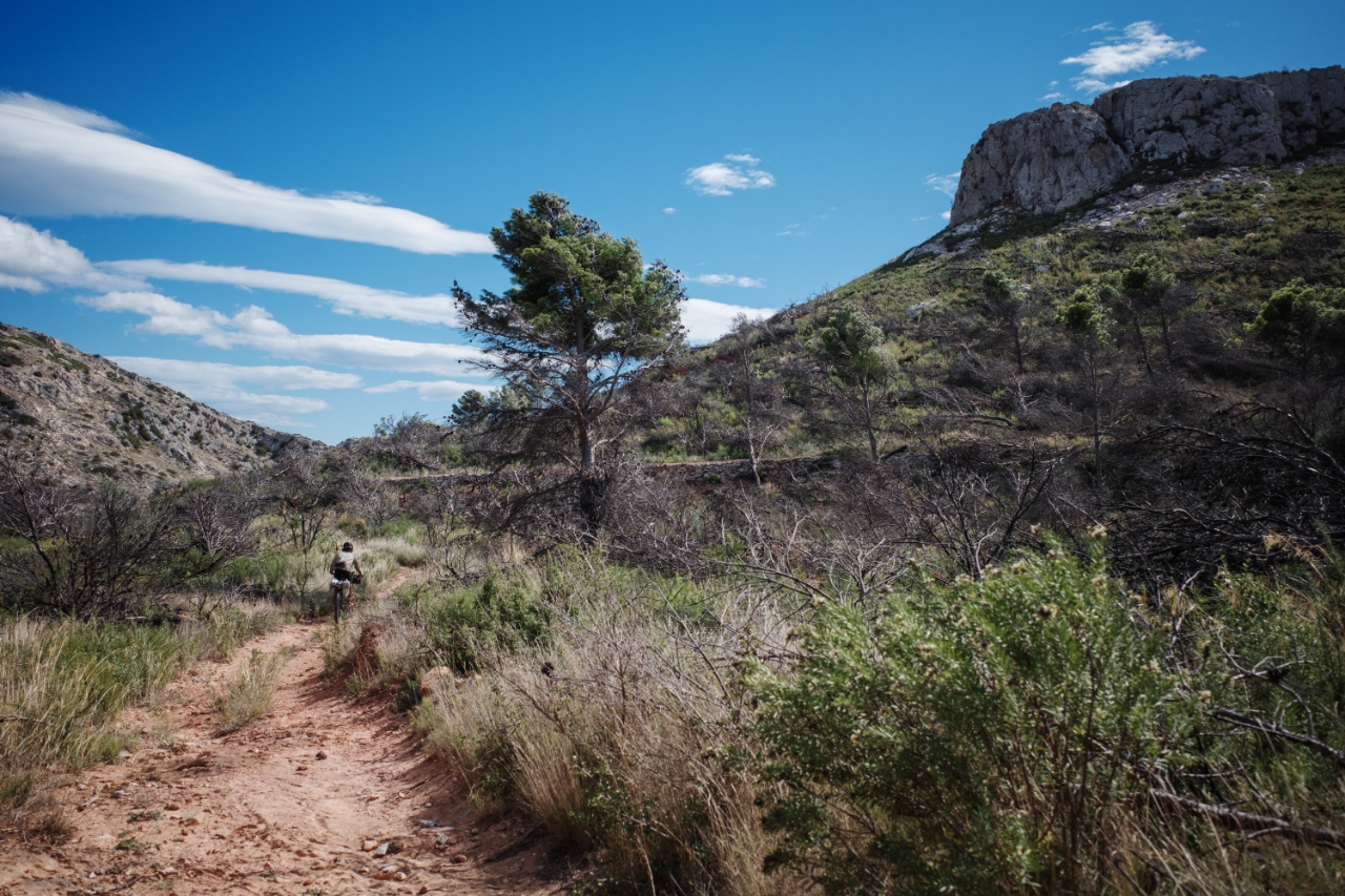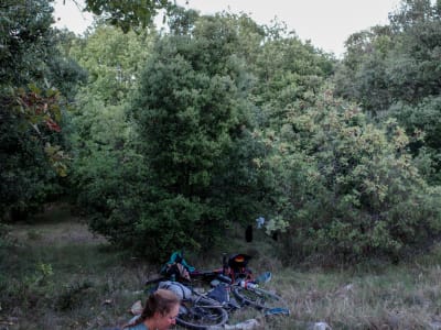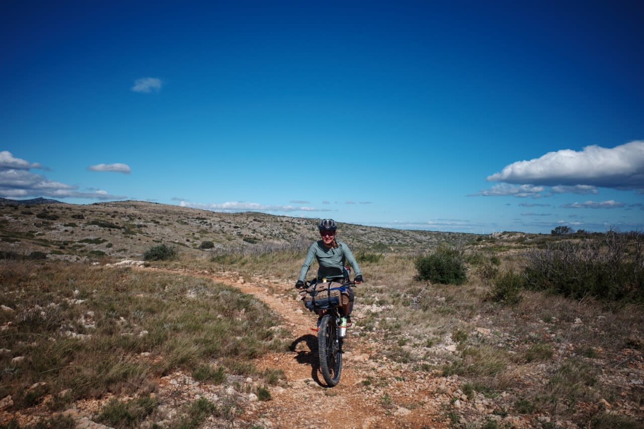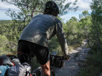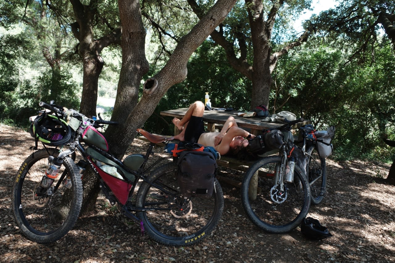 It was hard to leave the place, but we were also excited! The Mediterranean was getting closer, and we had our eyes set on it. We pedalled across this Martian landscape following some technical MTB trails. After that, we were mostly riding gravel trails between the vineyards of the South, crossing many little towns. The whole area is dominated by winegrowing, and it was hard to find good spots to pitch our tent for the night. The small woodlands we did find were too wild to camp in, so we hid in one of the winery domains and cooked our meal there. We pitched the tent at dusk and thought we were golden – but at three AM we heard the sounds of huge harvesting tractors nearby. We didn’t expect them to start that early. We were too alert to sleep after that, so we broke camp and had an early start to the day. We biked to the nearest town and had our coffee there instead! At least we didn’t get caught.