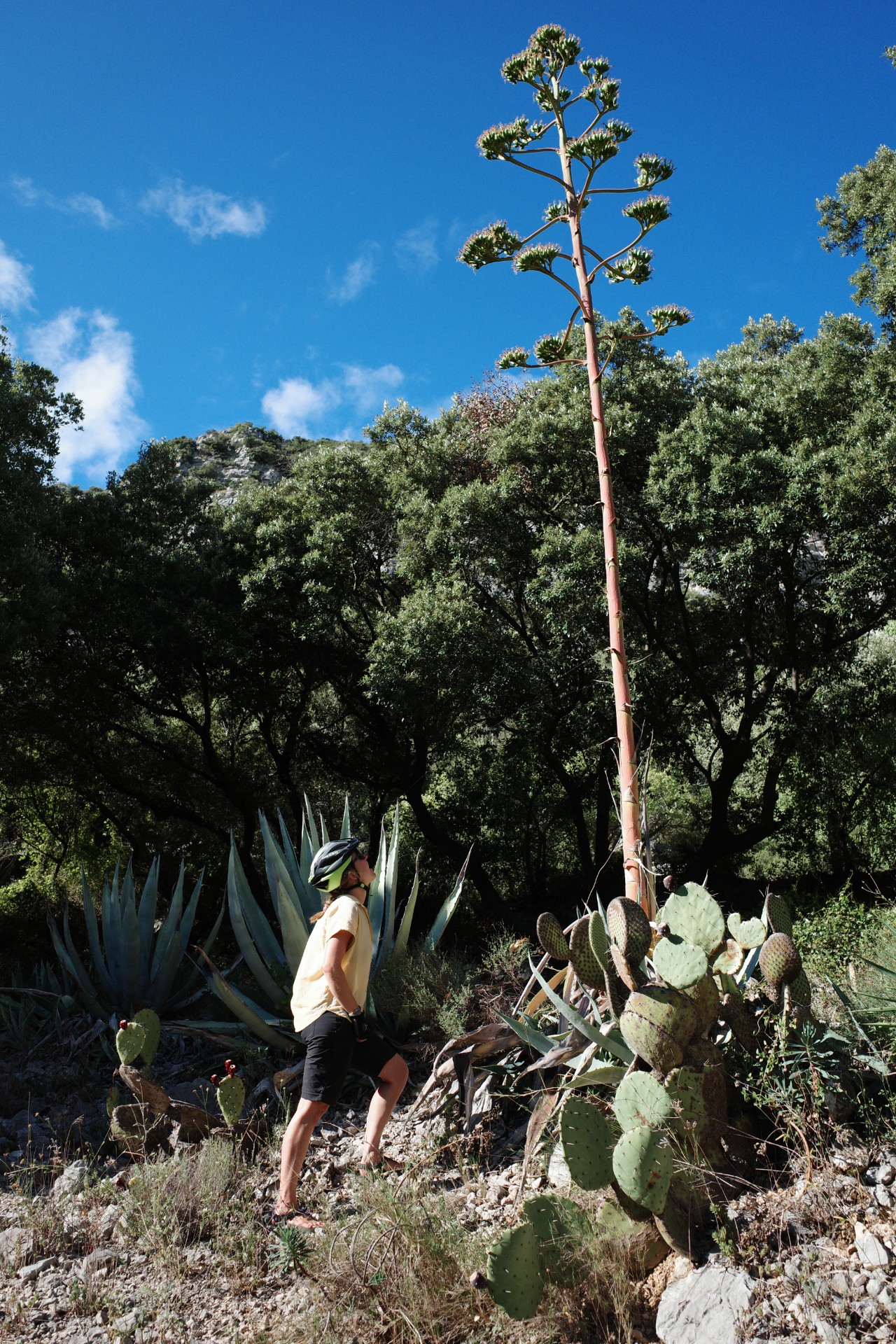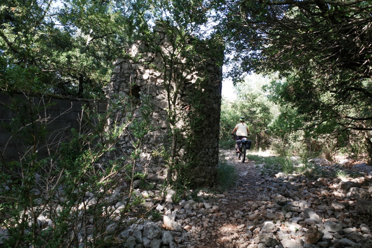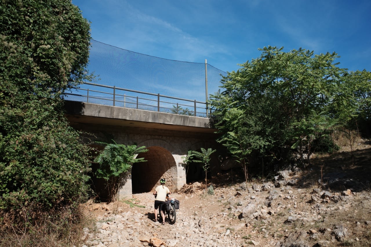 We left Camping La Fief near Alès and continued our way through the southern foothills of the Cévennes. The smooth riding we’d had in the previous days quickly ended, and we found ourselves riding some nice and rocky trails in garreau country – mostly limestone plateaus, ridges, and gorges. The flora was also very different to anything we’re used to, and we were inundated with the delicious scents of wild rosemary, lavender, and thyme. We harvested some for our meals at night! Suddenly, the trails were also lined with cacti and Aloe Vera plants, and lizards, big and small, were crawling between them. Spiky plants would occasionally cut open our legs and feet, but we felt so lucky to be riding here. We were really in the South of Europe now.