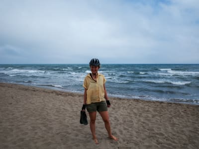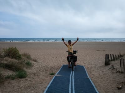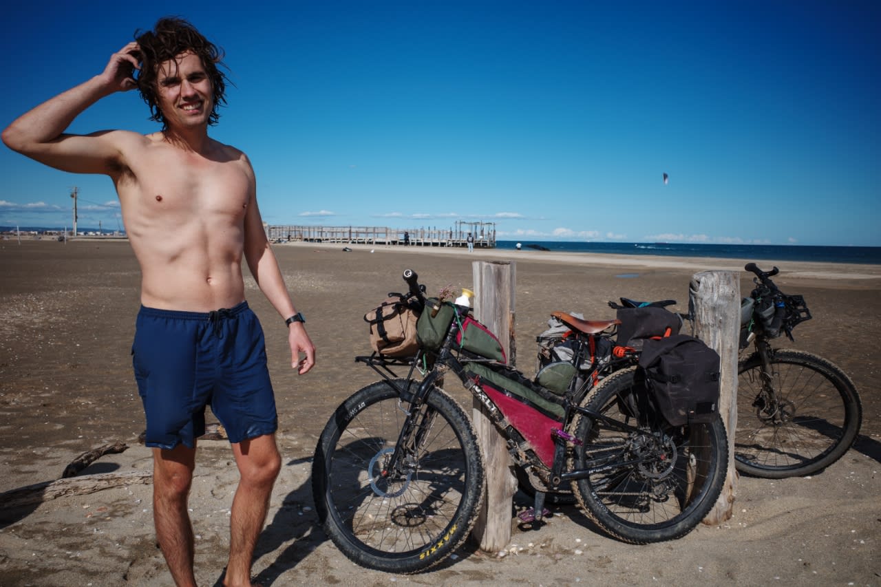 We soon reached the Mediterranean coastline after that. Unfortunately, we couldn’t climb over the massif fronting it because it was closed off due to the recent forest fires near Narbonne. Instead, we needed to detour around it to reach the sea. It didn’t matter, reaching the Narbonnaise en Méditerranée felt like another milestone of the trip, and we enthusiastically ran to the sea to dip our toes in it. We were elated to have made it there.