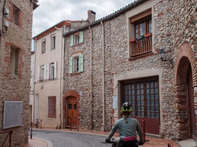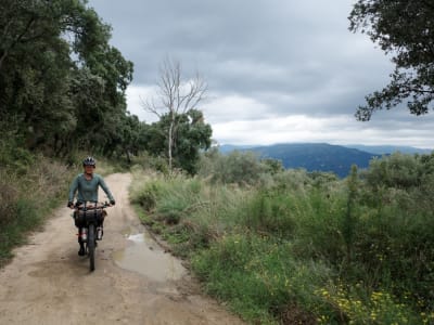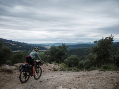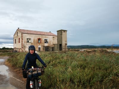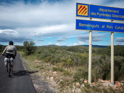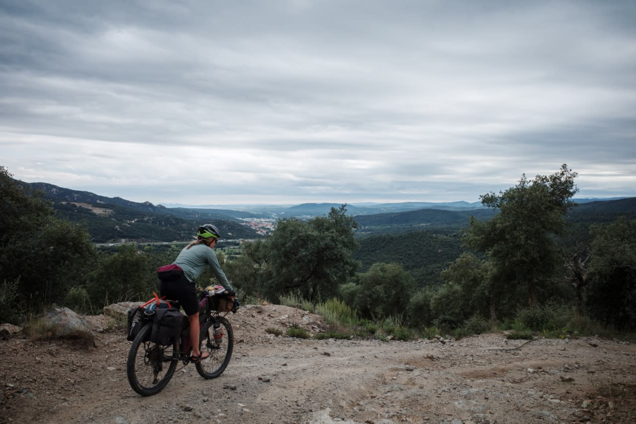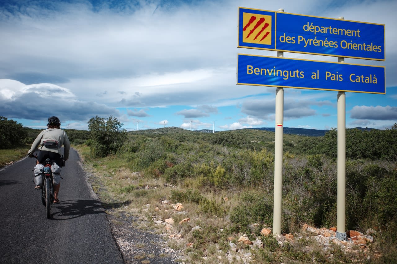 We climbed back into the hills towards Perpignan, fighting those same winds. The views were awesome from up there, but the riding was really rough! We caught our first glimpse of the magnificent Pyrenees in the distance, and the Mediterranean was still visible too. The strong wind gusts would push us off our bikes during the steepest climbs. The top of the pass was the worst. The frame bags acted as something of a sail, and we had to fight against our bikes to get to the other side. However, once we did, we finally had the wind in our backs, and we reached Perpignan in no time after that!
