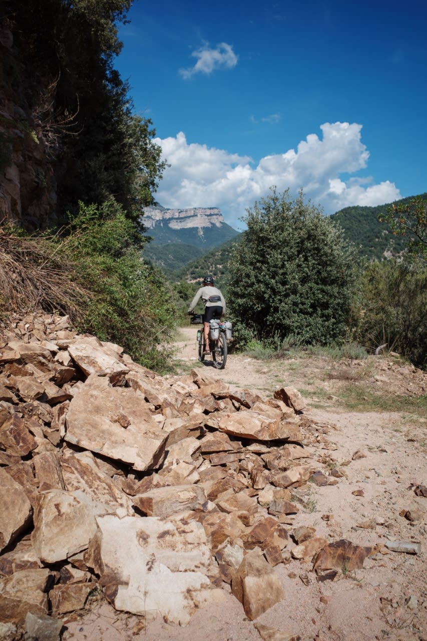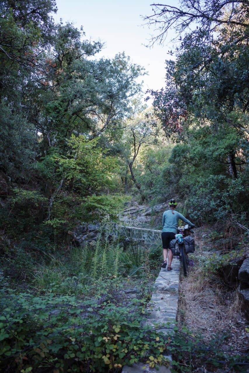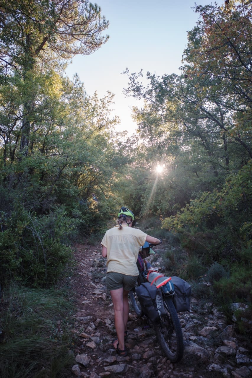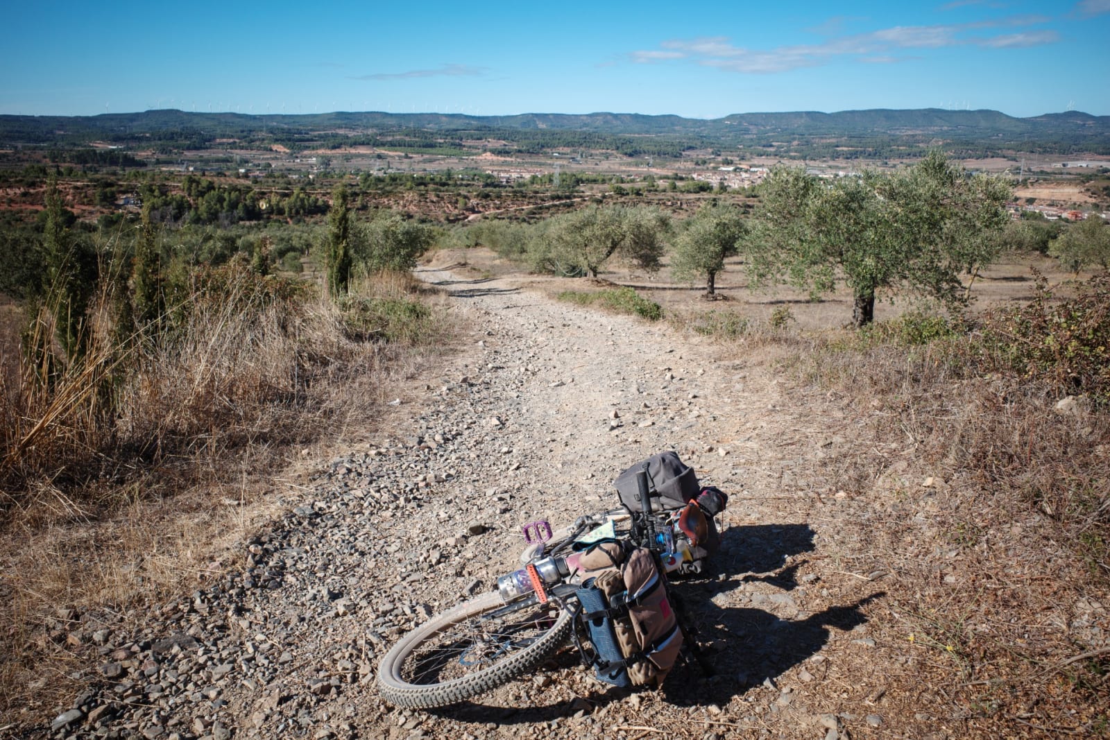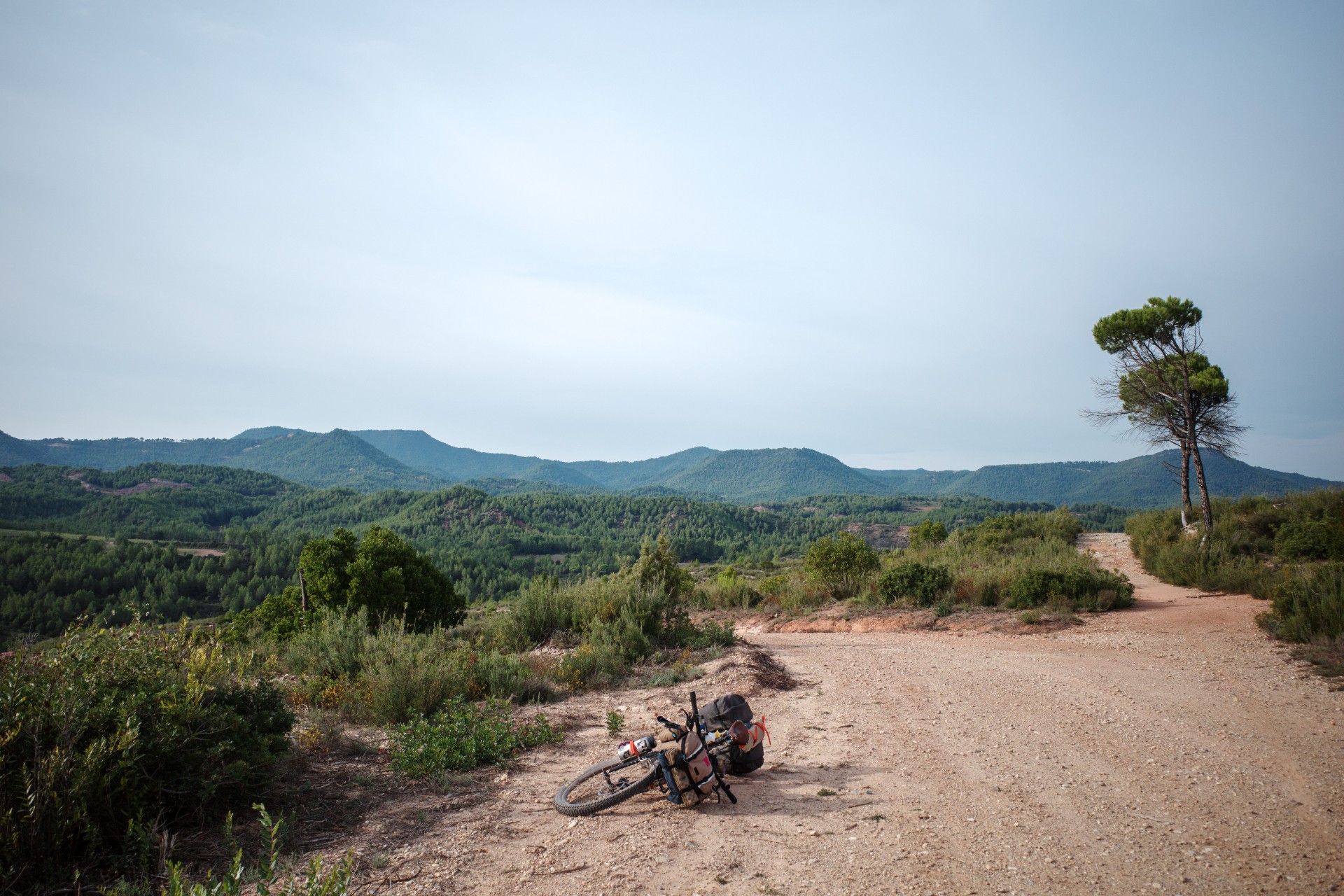 After that, we had some of our best days on the bike yet! We followed dirt roads along the mountains north of Barcelona. Soon, Montserrat was providing an incredible backdrop as we climbed steep ridges and descended into stunning valleys. There’s no denying that riding in Spain is often tough — most days were filled with very steep, drawn-out climbs on loose rock. Our hearts would sink each morning when looking at the elevation map on our Garmin. Sometimes, the route made no sense at all either, leading us up brutal trails seemingly just for the sake of it. We’d push our bikes up, cursing, but the views were amazing, and we were having a blast — definitely type 2 fun at times.